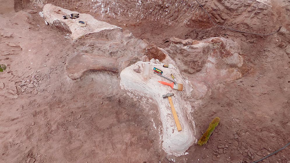 Las tareas de excavación requirieron cinco campañas paleontológicas y más de treinta días de trabajo de campo. Durante ese tiempo, para romper la roca portadora se utilizaron mazas, puntas, martillos, cortafierros, martillos rotopercutores, martillos neumáticos y cortadoras de roca. Para trasladar adecuadamente los huesos se armaron ocho bochones de yeso y arpillera, de los cuales, los más livianos fueron cargados en camionetas mediante un trípode y un malacate, mientras que, para los más pesados, algunos más de una tonelada, se necesitó la intervención de una máquina retroexcavadora y dos camiones.