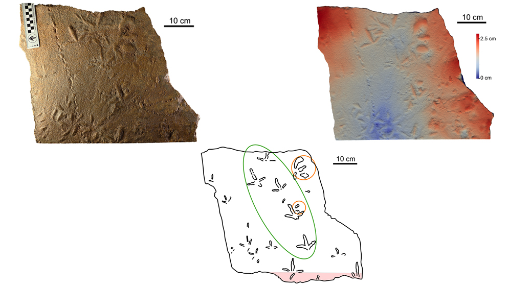 Patagonichnornis venetiorum corresponde a huellas pequeñas, con tres dedos delgados, similares a las que dejan hoy las aves costeras conocidas como shorebirds. En cambio, Tridigitichnus inopinatus fue atribuido originalmente por Casamiquela a un pequeño dinosaurio, posiblemente un hadrosaurio, aquellos famosos dinosaurios herbívoros de “pico de pato”. Las lajas que conservan estas huellas se formaron durante el Cretácico Superior tardío, hace aproximadamente 72 millones de años.